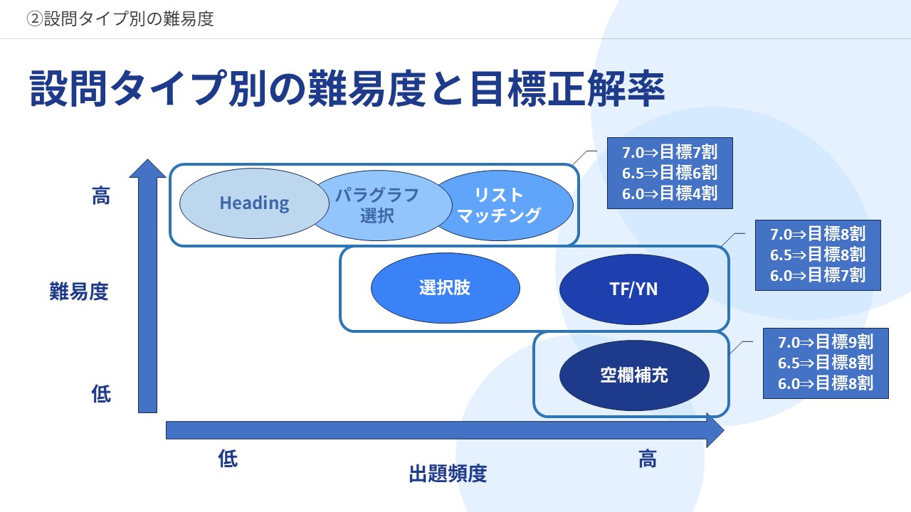 - リストマッチング問題、Heading(パラグラフタイトル)問題、パラグラフ選択問題がもっとも難易度が高い。