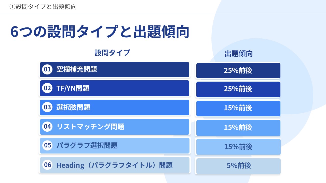 難易度高⇒「リストマッチング問題」「パラグラフ選択問題」「Heading問題」