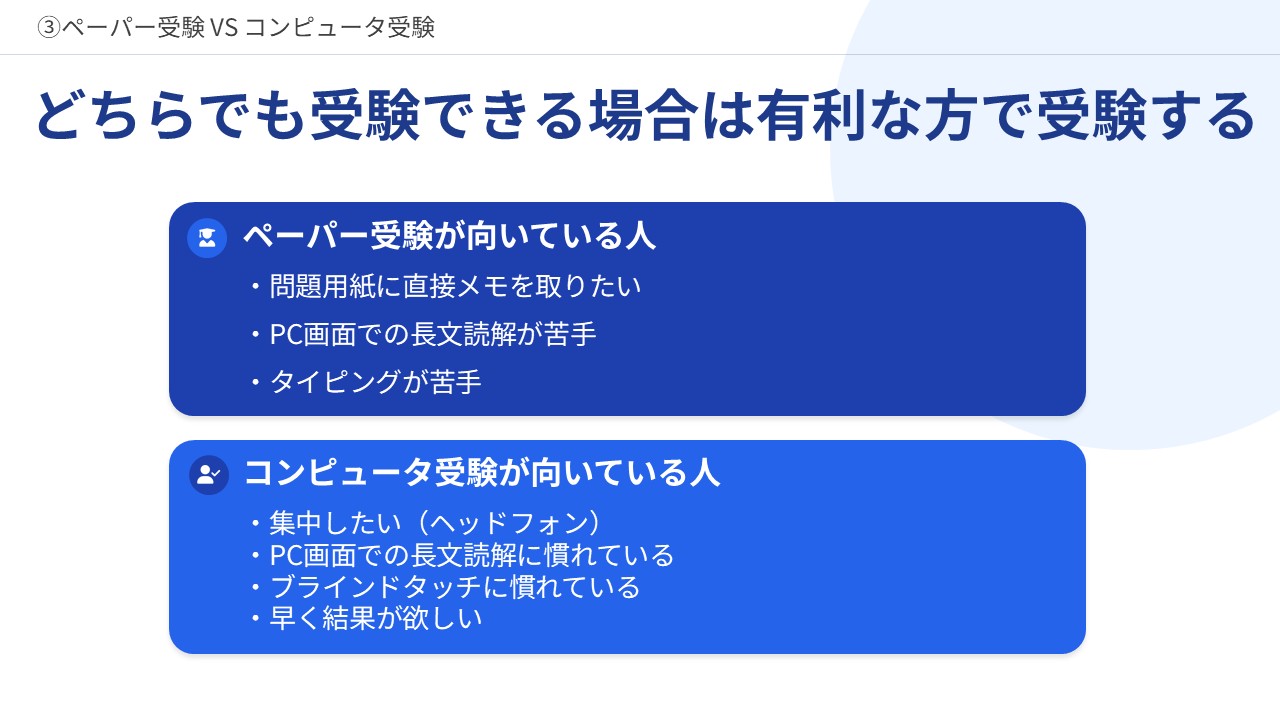 | メモの取り方 | 問題用紙に直接書き込み可能 | 画面上でハイライト・メモ可能 配布されたメモ用紙 |