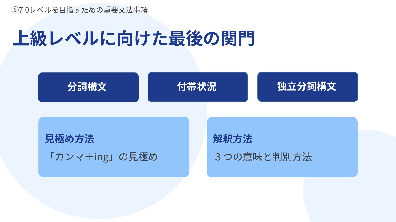 • 文章の中で、分詞構文、付帯状況、独立分詞構文をきちんと見極められるかは、7.0以上と7.0以下を分ける1つの境目