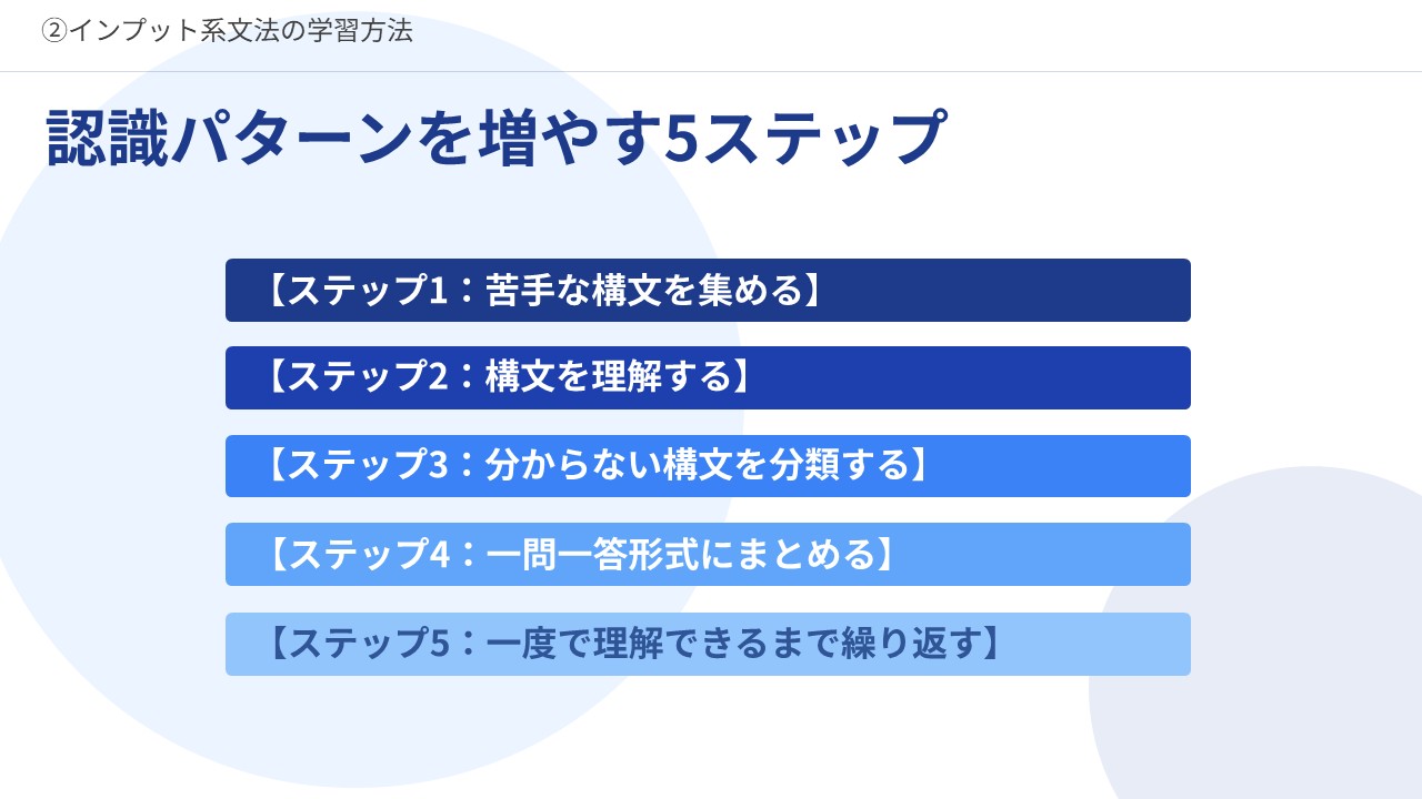 • 「認識できる構文パターン」を増やしていくのが、インプット系文法の学習方針。