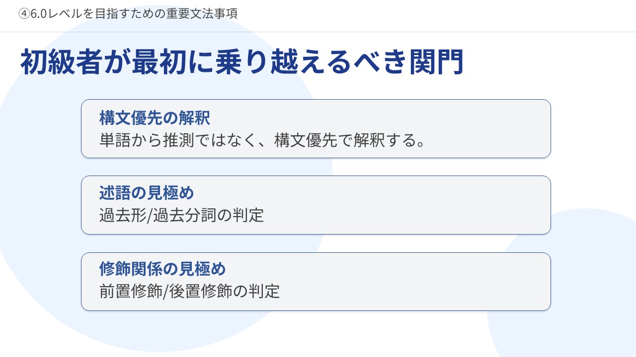 • 構文を無視して単語から推測で読むのではなく、あくまで構文に沿って解釈すること、そしてその構文を理解するための第一歩として、文章の骨格である「主語と述語」を見分けられるスキルを身につける必要がある。