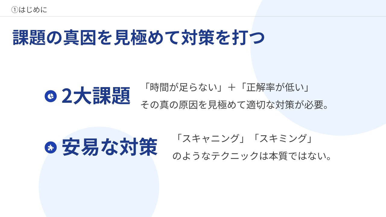 - しかし、必要なスキルが身についていない段階でどれだけ読む量を増やしても、なかなかスコアが上がらない。