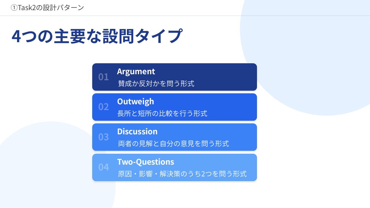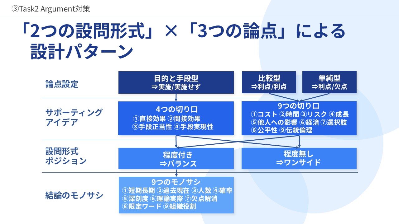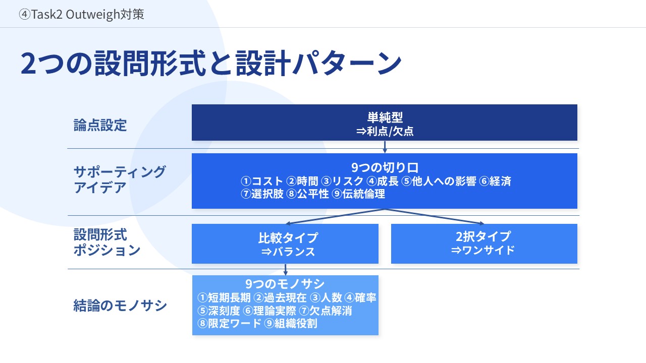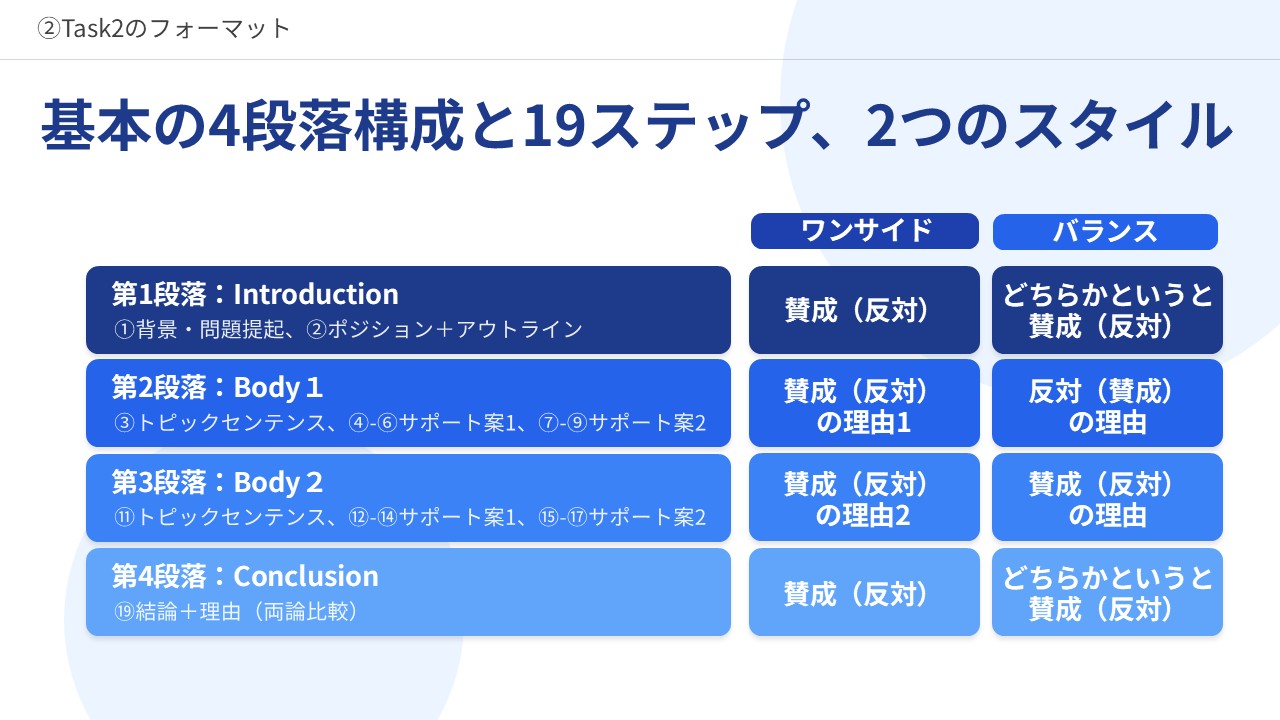 - バランス:例えば賛成のポジションであっても反対・賛成双方の理由を書く方式。賛成のポジションの場合は、Body1で反対の理由を説明したあとにBody2で賛成の理由を説明する。