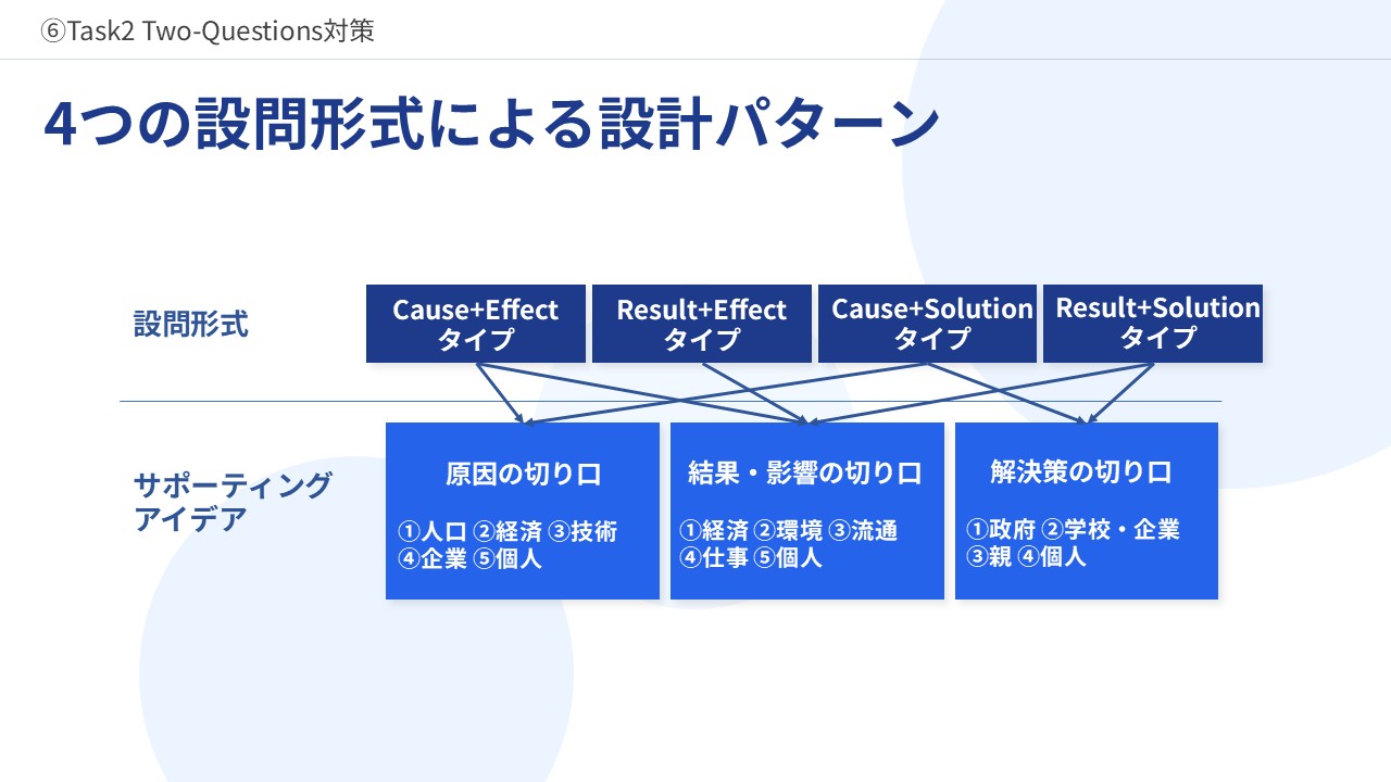 - ある現象に対して、「原因、影響、解決策などのうちの2つ」を問われる問題
