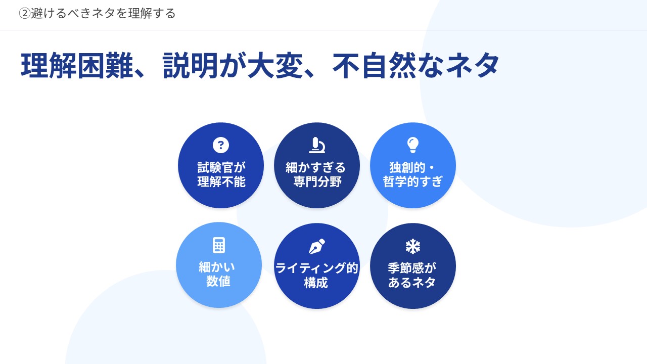 試験官が理解できないまま終わるようなネタは選択しない
