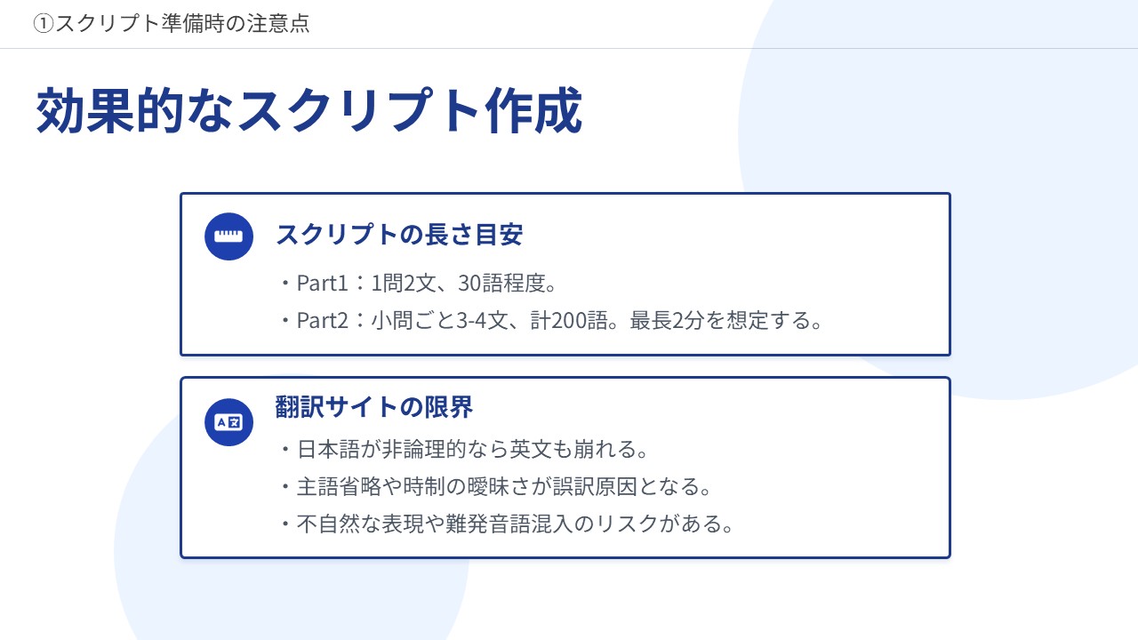 - 自然なスクリプトを作成するには最終的にはネイティブスピーカーによるチェックが望ましい。
