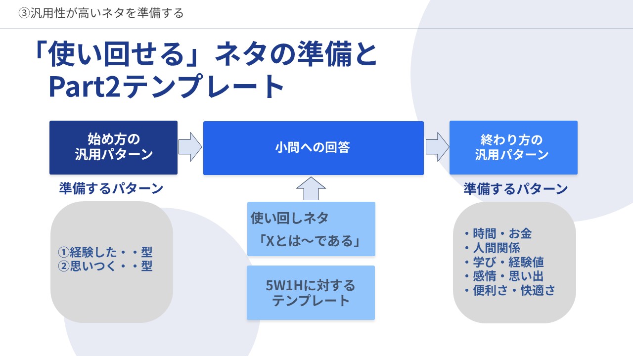 - すべての質問に対して異なるネタを準備するのではなく、一つのネタを様々な質問に対して使い回すようにする。