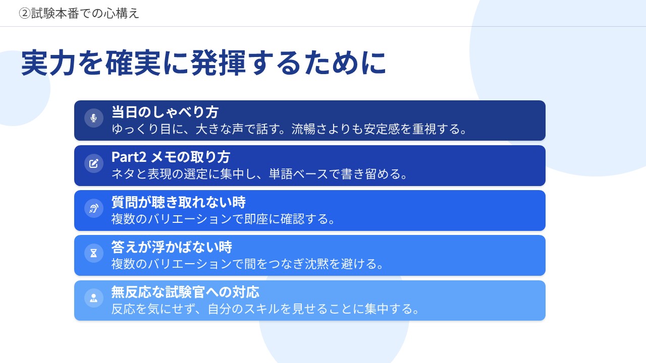 • 評価されるのは「速く話せる」よりも「安定して話せる」なので、むしろゆっくり目にしゃべった方が良い