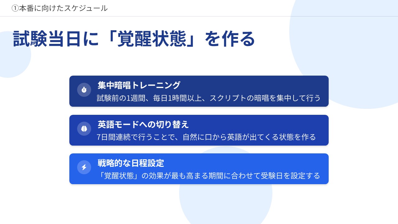 • スピーキングは最終的に準備したスクリプトを暗唱して覚えていくが、この暗唱を試験前の1週間で毎日1時間以上集中して行う。